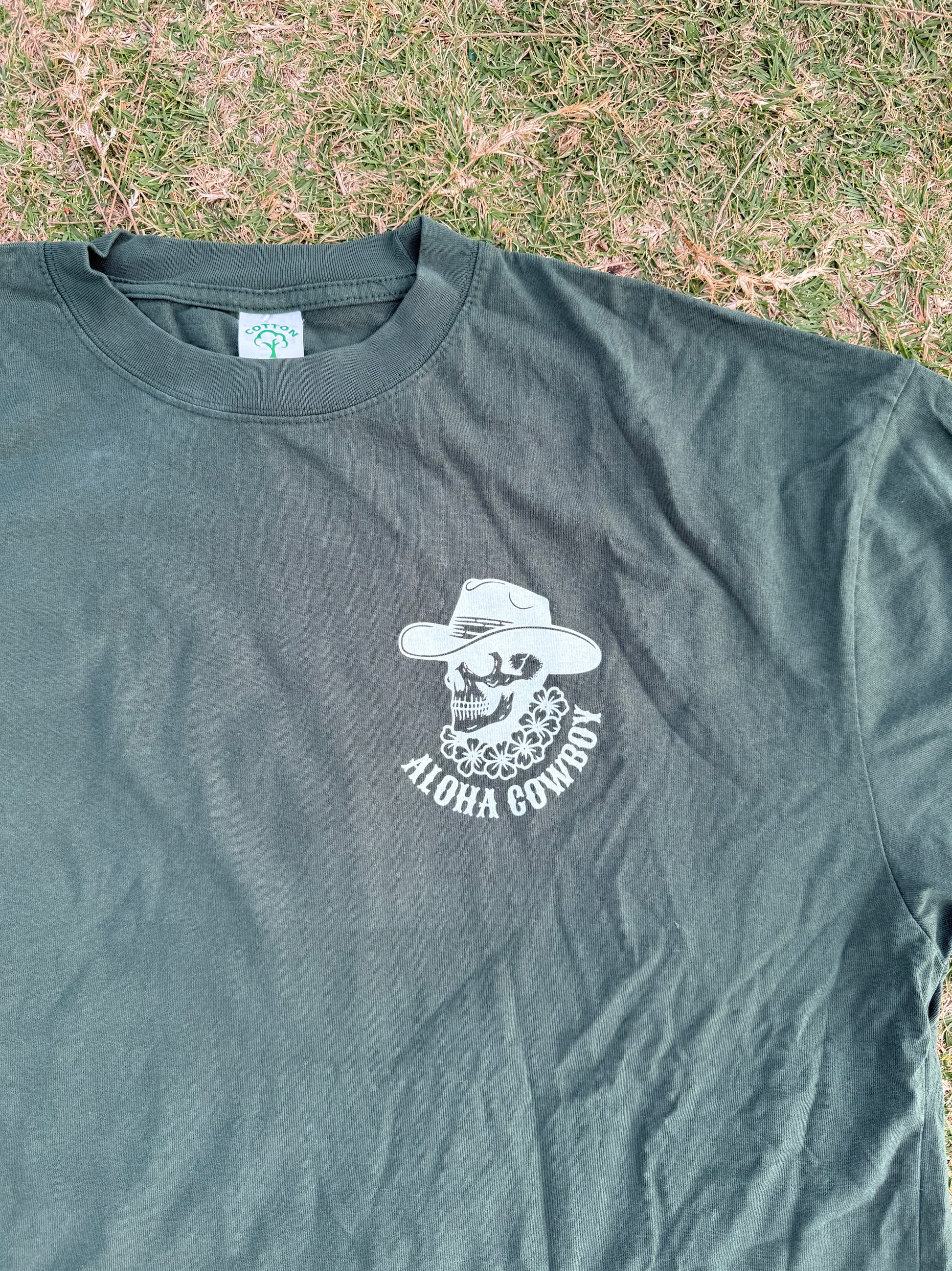 Ride between worlds in the Ghost Rider Tee — a bold blend of western grit and island spirit. Featuring the signature Aloha Cowboy skull graphic with a cowboy hat and lei, this design captures the fearless energy of the open range with a touch of Hawaiʻi soul.